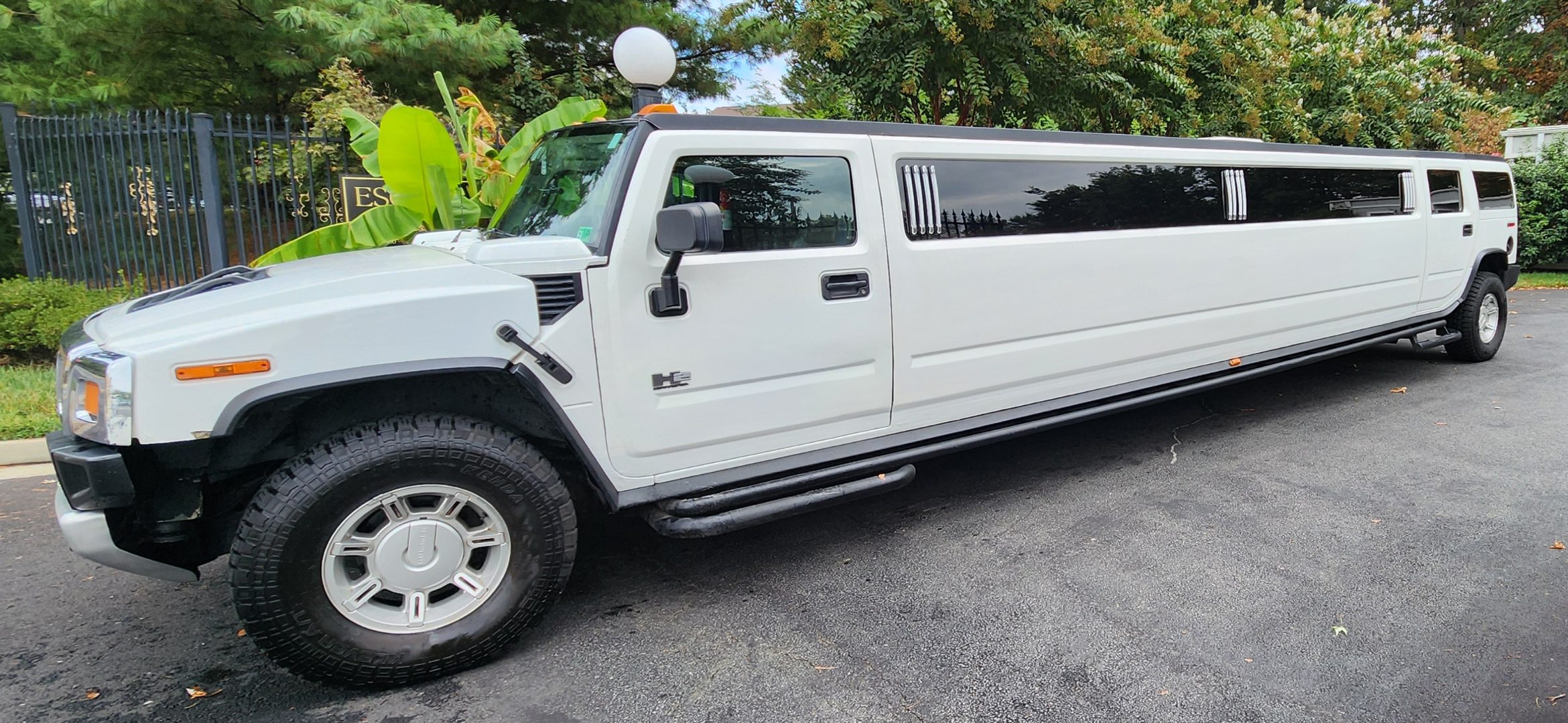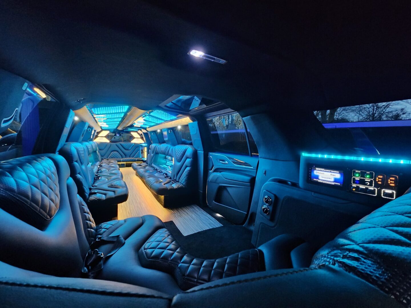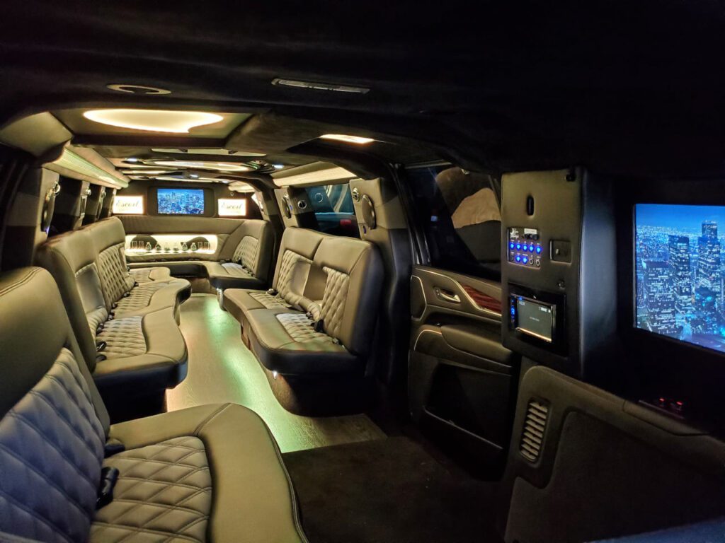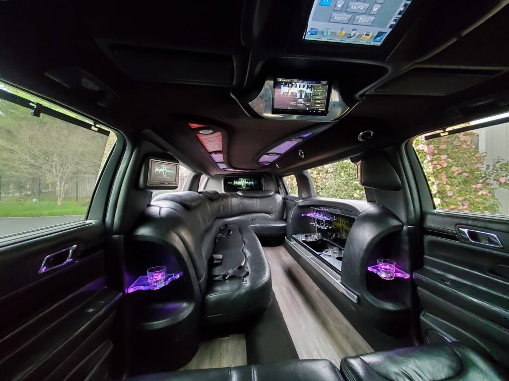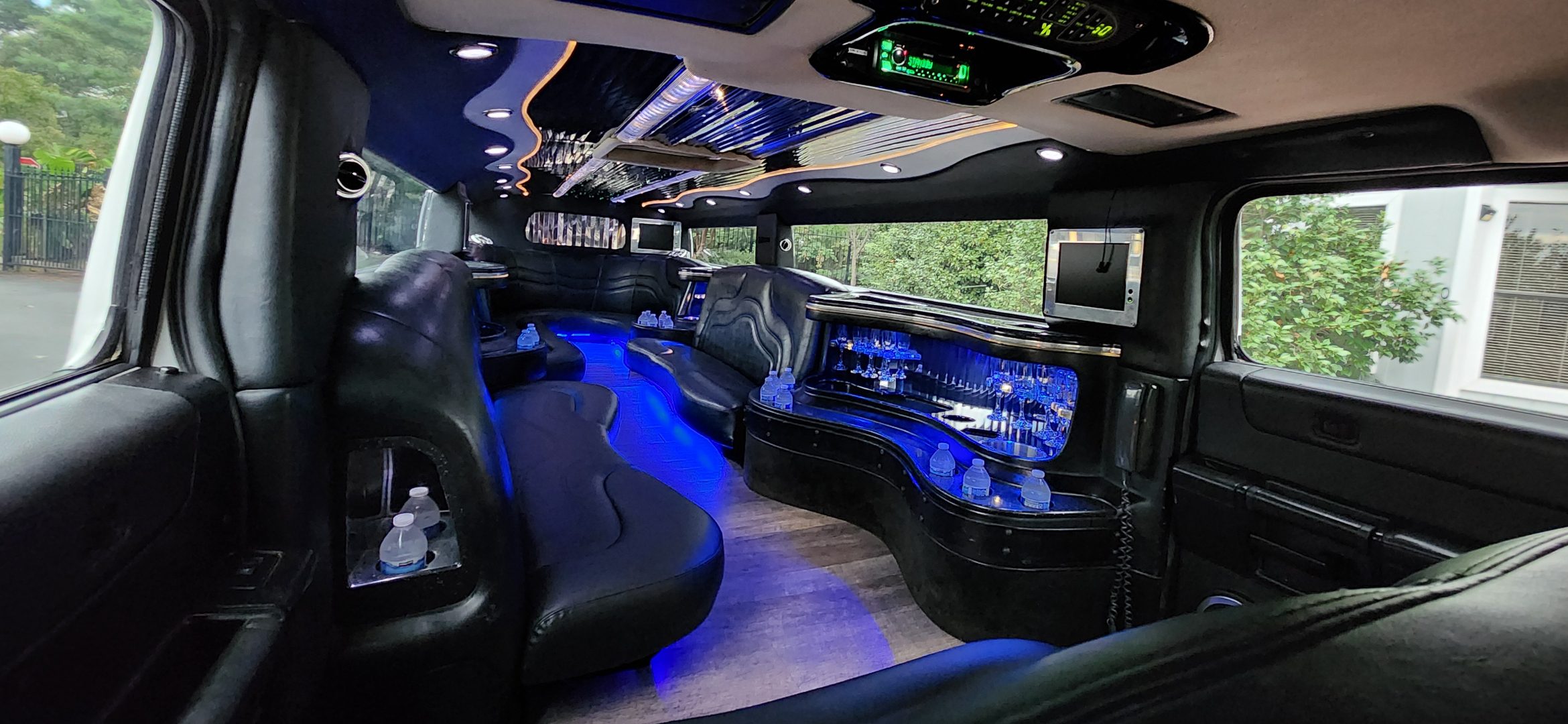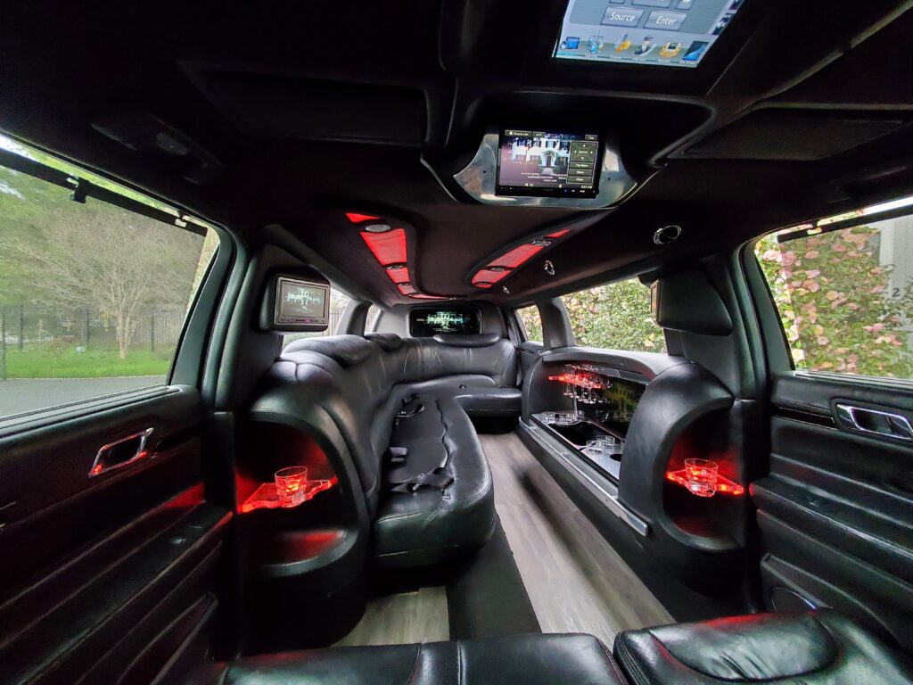 Stylish limo with seating for 8–10 people with a fifth door for easy access. Black leather interior, bar, stainless steel ceiling with starlights and fiber optic lights, color lighting effects, champagne wells, ice chests, sound system with subwoofer, DVD/CD player with Bluetooth, champagne glasses, cocktail glasses, and flat-screen TVs.