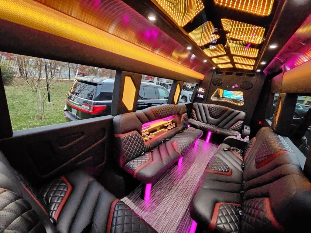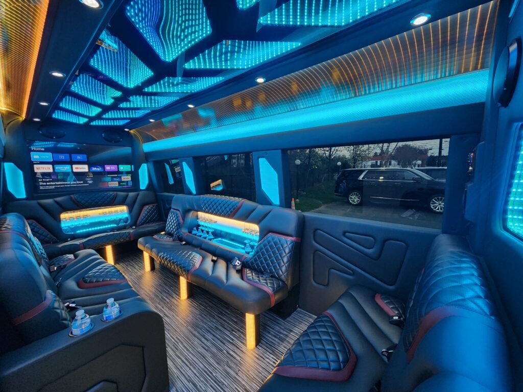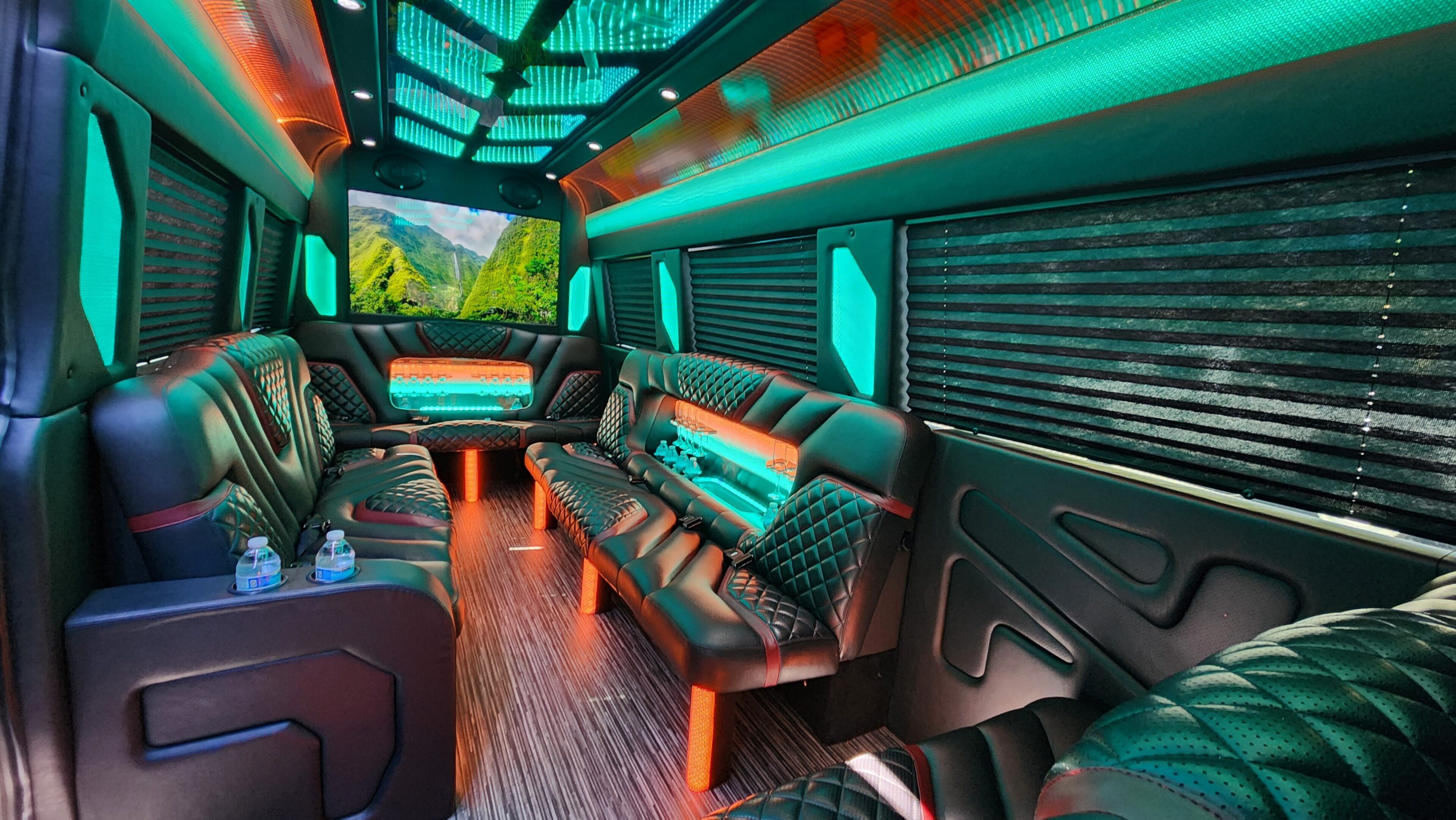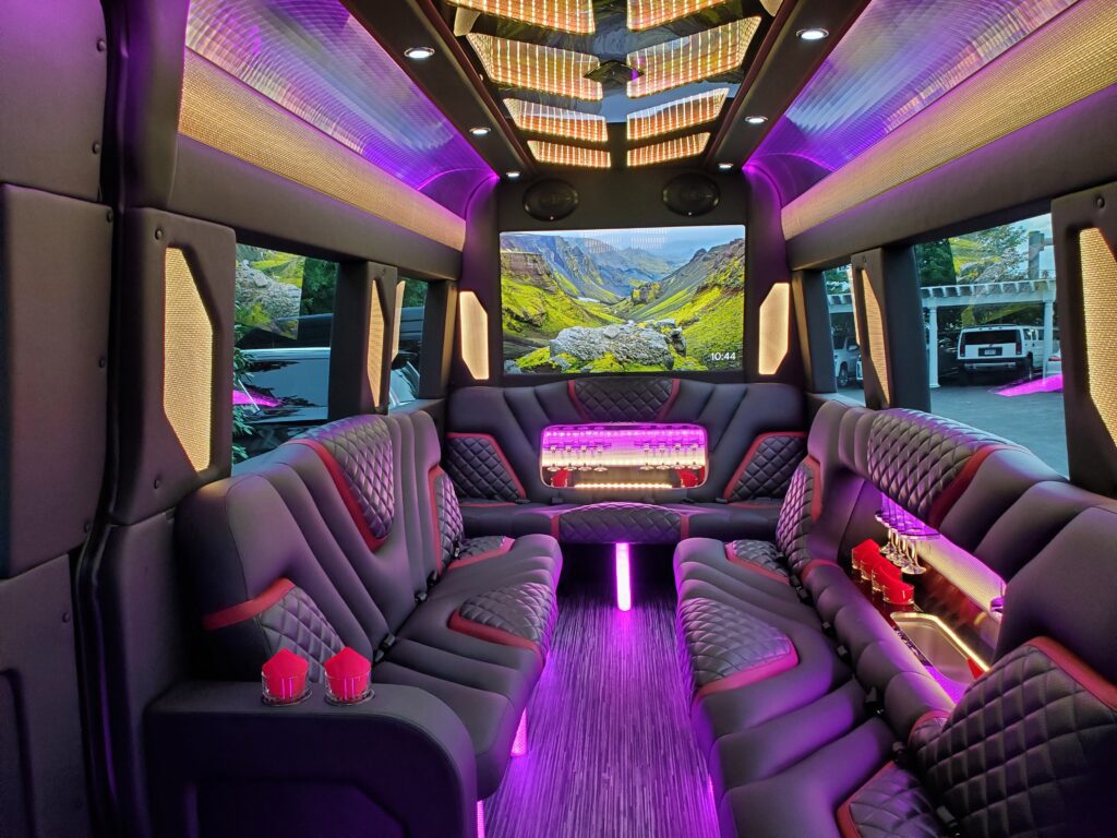 The Sprinter Limo is a 14 passenger limousine suitable for all occasions and is fully loaded with all amenities. Such as Premium Leather Seats, Hardwood Floor, RGB lighting for the party look and all white lighting for an executive look, Fiber optic lighting, Touch Screen Entertainment, Ipod Aux Integration, Infinity Ceiling lights, Conventional Seating, A/C Power Outlets, Mood Lighting, Window Shades, Flat Screen TV, Sound System with SubWoofer and Bluetooth.