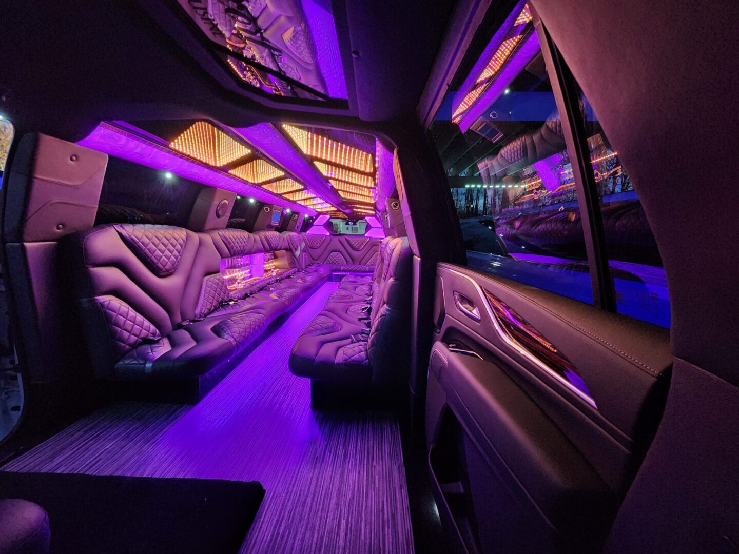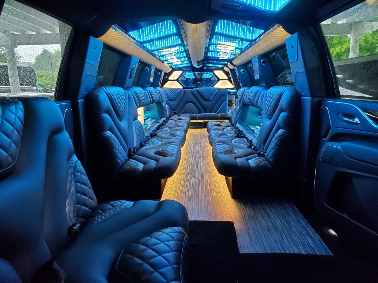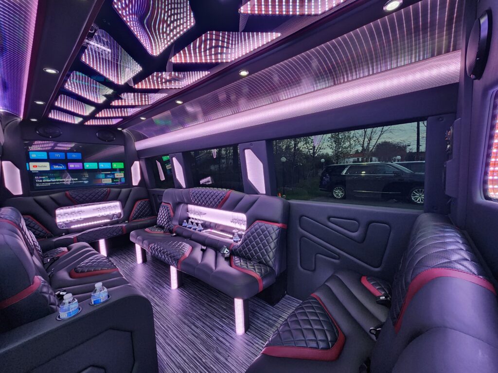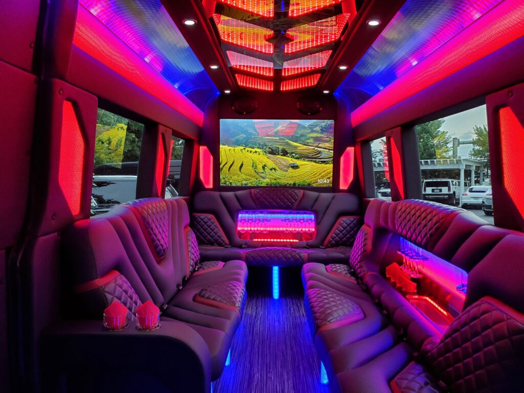 The Sprinter Limo is a 14 passenger limousine suitable for all occasions and is fully loaded with all amenities. Such as Premium Leather Seats, Hardwood Floor, RGB lighting for the party look and all white lighting for an executive look, Fiber optic lighting, Touch Screen Entertainment, Ipod Aux Integration, Infinity Ceiling lights, Conventional Seating, A/C Power Outlets, Mood Lighting, Window Shades, Flat Screen TV, Sound System with SubWoofer and Bluetooth.