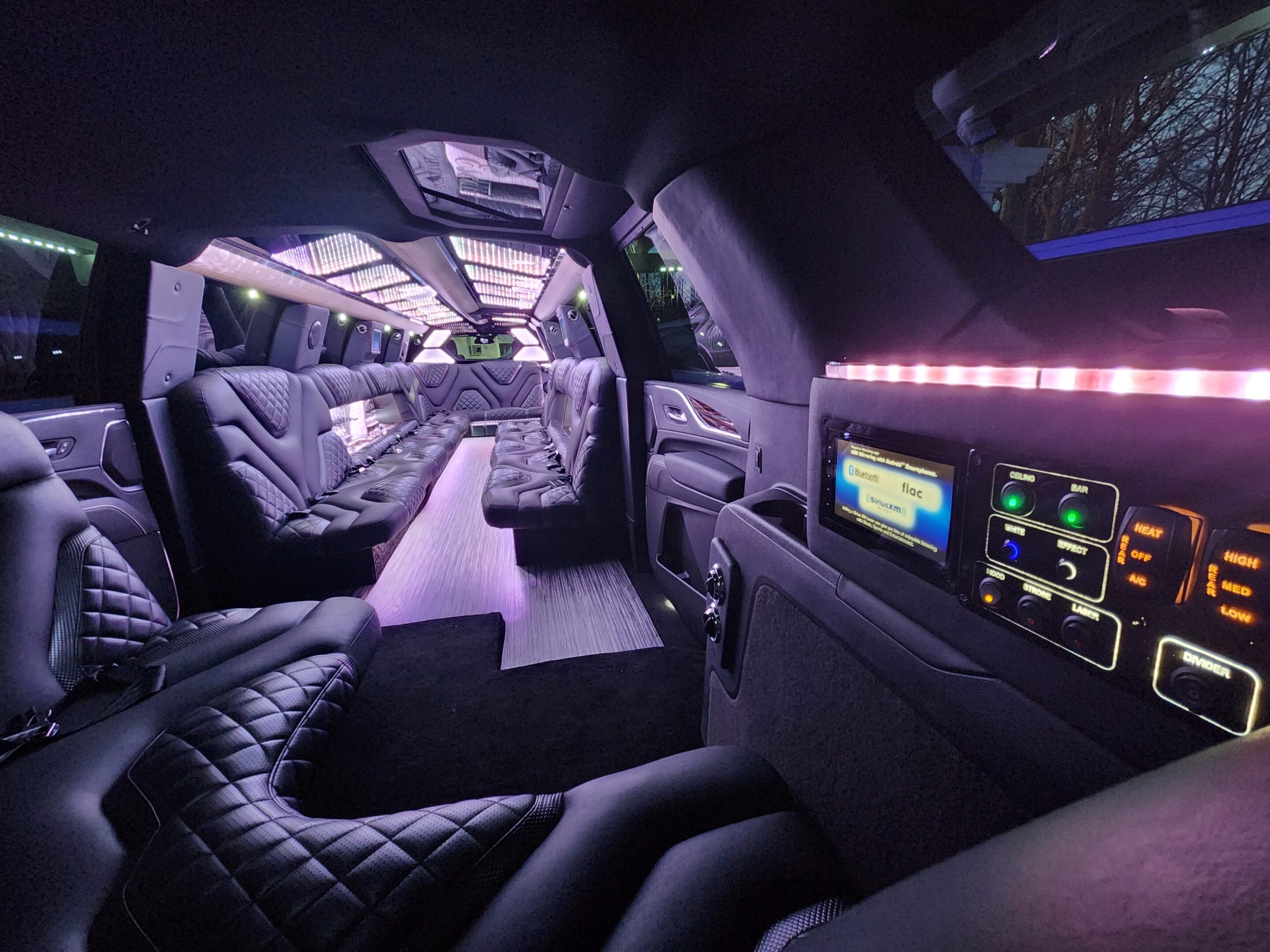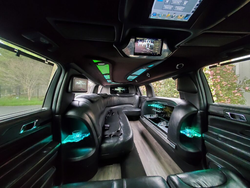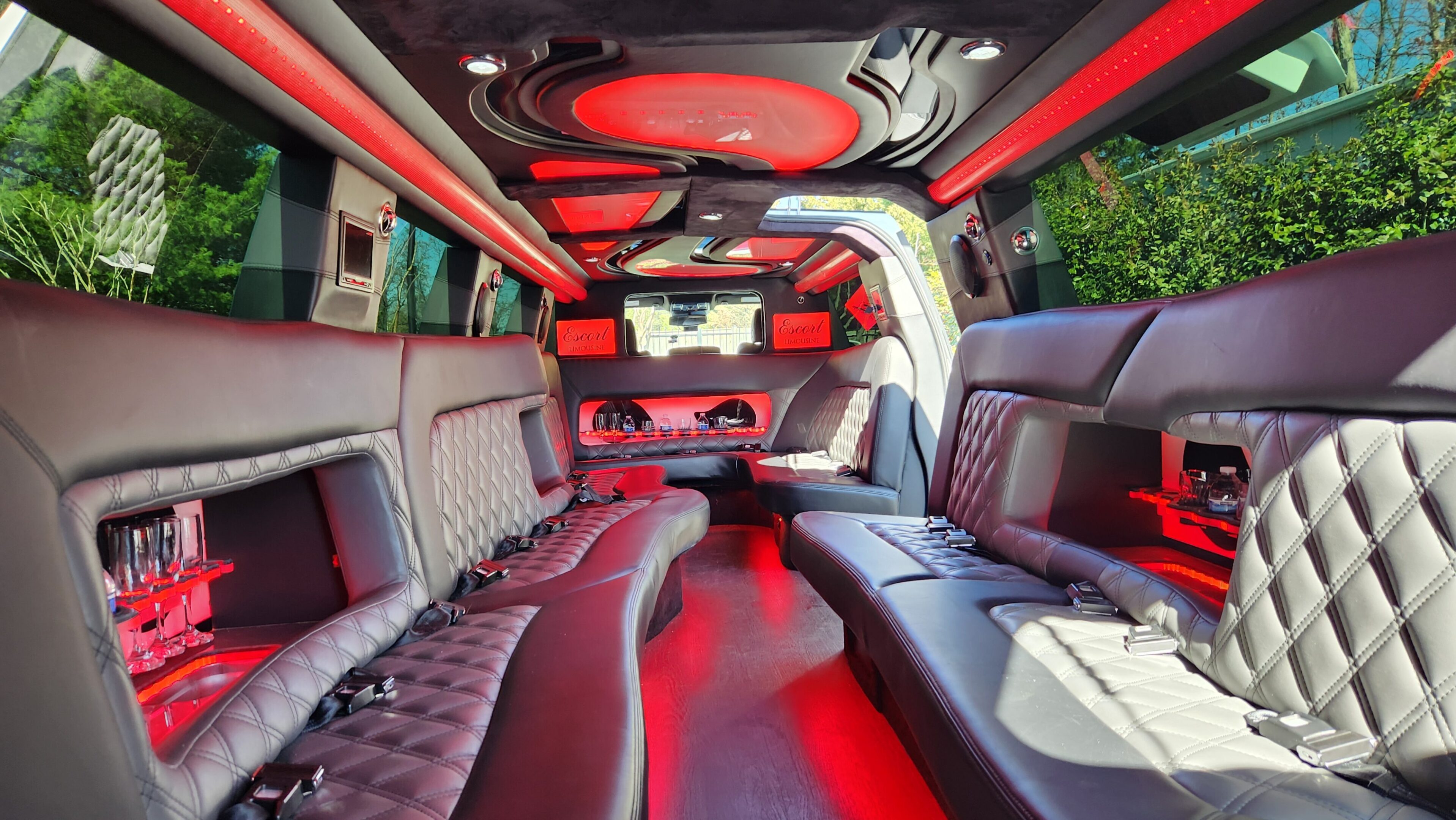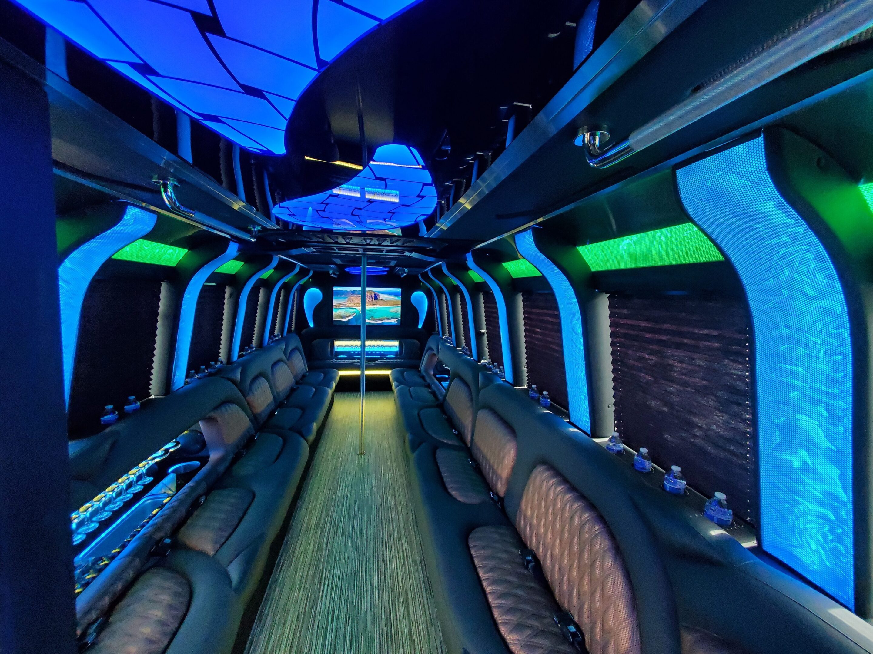 This is a party room on the wheel with a cozy and one-of-a-kind interior. Wrap-around two-tone leather seats with seating for 28–30 people. Color wash on ceiling and walls with fiber optic lights, neon lights, strobe lights, floor lights, opera lights, bar lights, cove lights, strobe lights, laser lights, four large bars with acrylic counter top, 50" flat screen TV, great sound system with subwoofer, CD/DVD and Bluetooth, hardwood floor. Ideal limo for almost any occasion, whether it is for weddings, winery tours, city tours, birthdays, proms, concerts, corporate functions, or out-of-town trips.